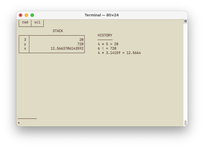 to version 0.2.0, with a much clearer view of the stack, the ability to use degrees and radians, and to change the number representation format, as well as a more compact help.