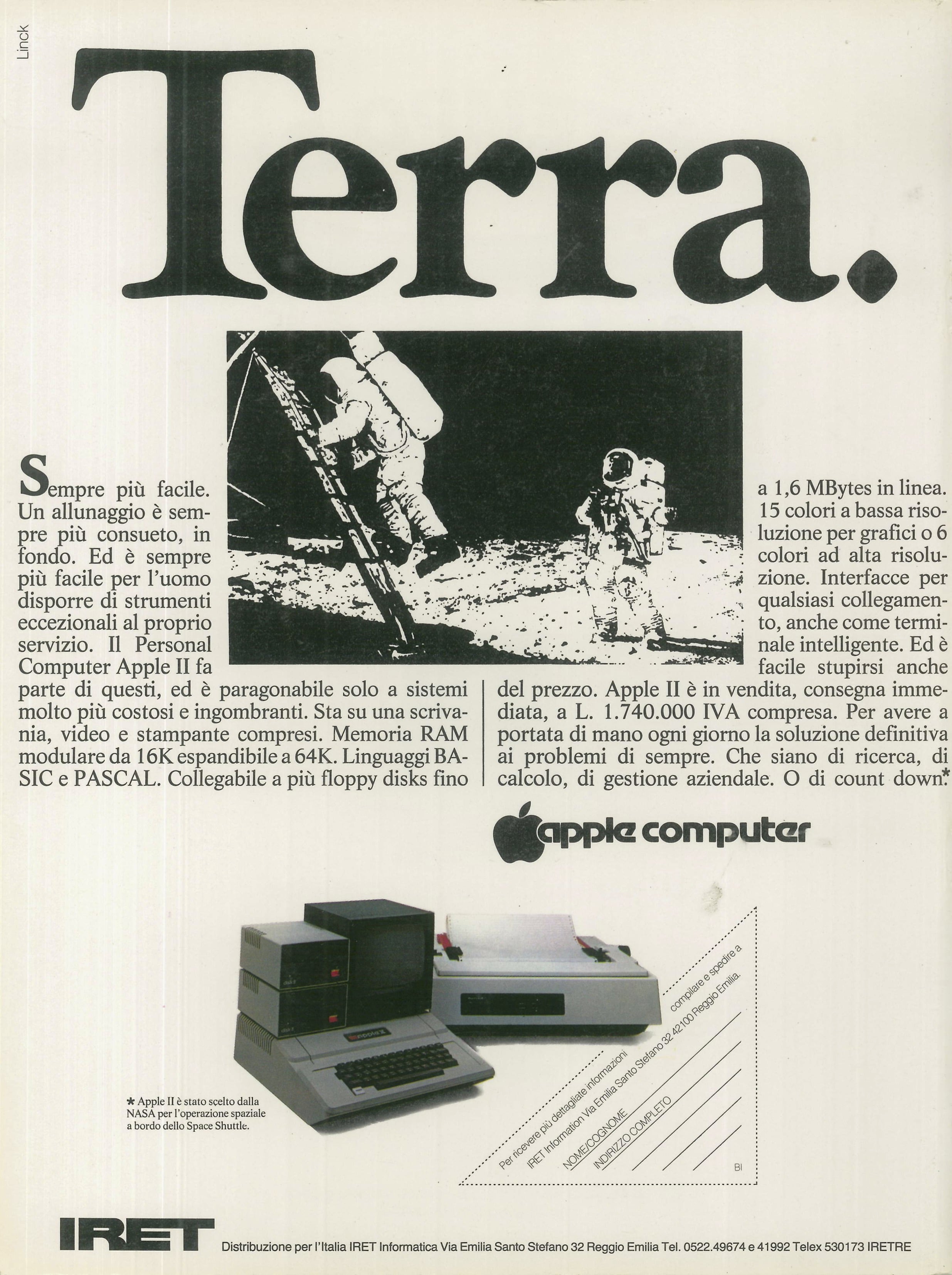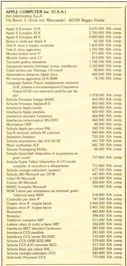 If you compare the price of the base Apple II reported in this image with that of the advertisement on Bit, you’ll notice that in less than two years the price of the base Apple II had increased by a whole million lire (roughly 1,000-1,500 euros today) due to the rampant inflation of those years. ↩︎