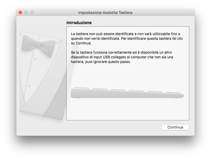 In fondo tutto quello che volevo era far comparire il solito Assistente di configurazione della tastiera, che chiede di identificare la tastiera premendo il tasto a destra della Maiuscola sinistra. Ma come?