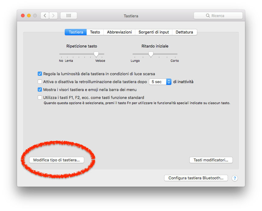 Il problema è che questo pulsante sembra un po’ ballerino, a volte appare e a volte scompare dalle impostazioni della Tastiera, senza che si riesca bene a capire il perché. Ad esempio, come si può vedere qui sotto, su un altro Mac in questo momento il pulsante non c’è (qui è installato High Sierra, ma da quanto ho capito non è una questione di sistema operativo).