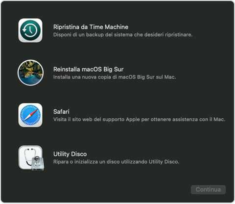 Sui Mac con processore M1 la procedura di accesso a macOS Recovery è stata ulteriormente semplificata, si deve spegnere il Mac e riaccenderlo continuando a premere il tasto di accensione finche non compare la scritta “Carico opzioni di avvio…”. Dopo qualche secondo comparirà una nuova finestra, dove bisogna selezionare il pulsante Opzioni e fare click su Continua (Figura 1), aprendo così la finestra principale di macOS Recovery con l’elenco delle utility disponibili (Figura 2).
