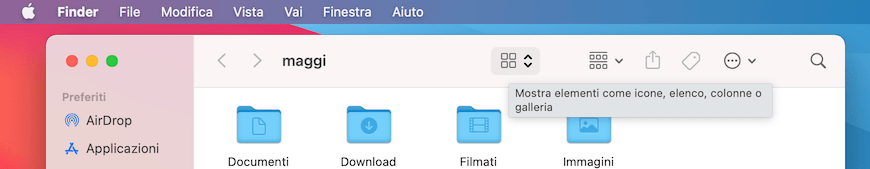 Se volessi vedere tutte le icone della barra degli strumenti dovrei allargare parecchio la finestra del Finder, una cosa che può non essere un problema su un monitor da 27", ma che diventa piuttosto seccante sul piccolo schermo dell’Air, perché significa occupare più della metà della larghezza del desktop. L’unico vero vantaggio di questa configurazione è la possibilità di passare con un click da una all’altra delle quattro modalità di visualizzazione dei file, una cosa che trovo molto comoda e di fatto irrinunciabile (ma dovrei ricordarmi una buona volta che ci sono le combinazioni di tasti ⌘1 - ⌘4 per fare la stessa cosa).