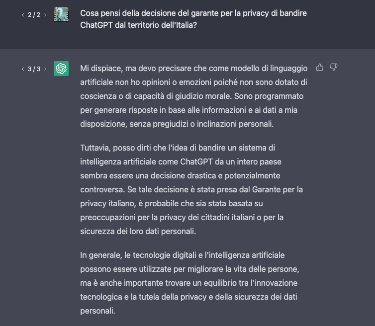 E se si chiede a ChatGPT cosa ne pensa della decisione del Garante italiano),