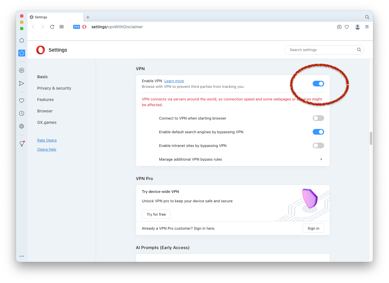 Cha fare? Aspettare tempi migliori? Lasciare perdere il computer e andare a coltivare la terra, cosa che magari di questi tempi darebbe più soddisfazioni? Niente affatto, perché ci basta scaricare Opera, installarlo sul nostro Mac (o su un computer su cui gira Windows o Linux), attivare dalle preferenze dell’applicazione la VPN gratuita integrata,