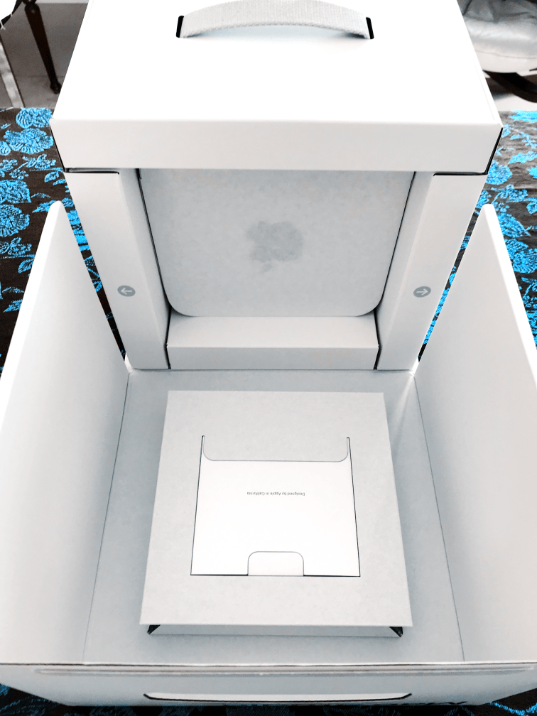 Sembra davvero un Mac Mini cresciuto in altezza e ora sembra pesare il giusto in rapporto alle sue dimensioni. Tutto il peso aggiuntivo è dovuto alla scatola che, ora si vede benissimo, è studiata per proteggere al meglio il prezioso oggetto al suo interno.